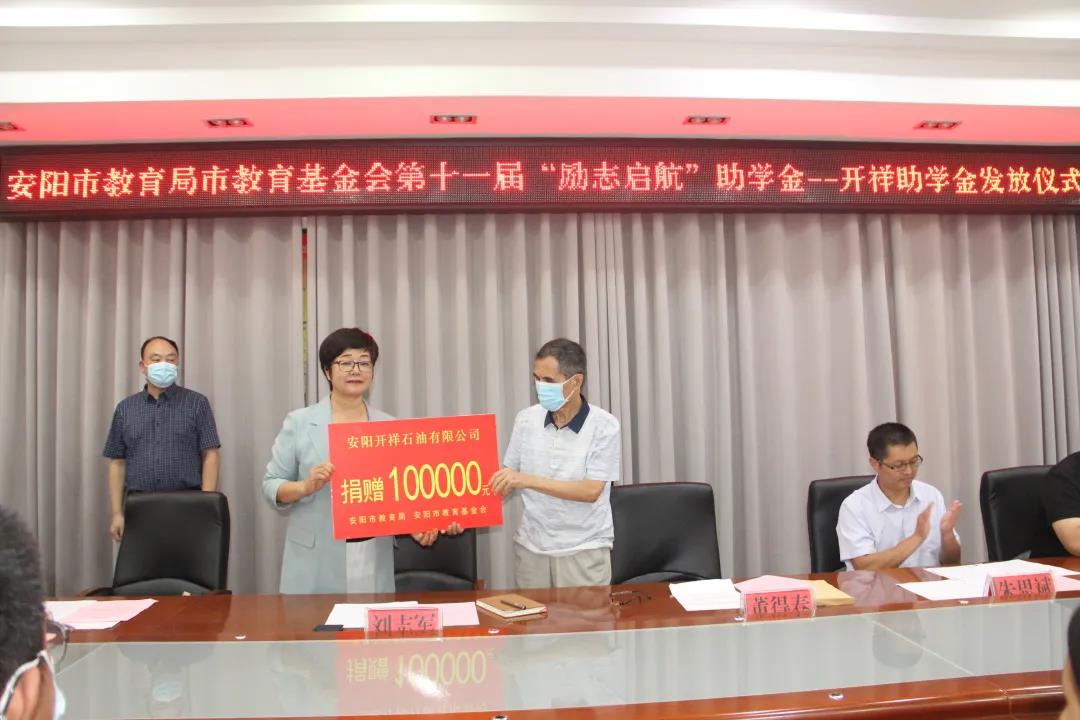 8月30日下午,安阳市教育局 安阳市教育基金会第十一届“励志启航”助学金——开祥助学金发放仪式在安阳市教育局举行。安阳市教育局党组成员、二级调研员刘志军,安阳市教育基金会副理事长兼秘书长董得春,安阳开祥石油有限责任公司总经理乔美玲,受助学校及学生、家长代表参加了此次活动。