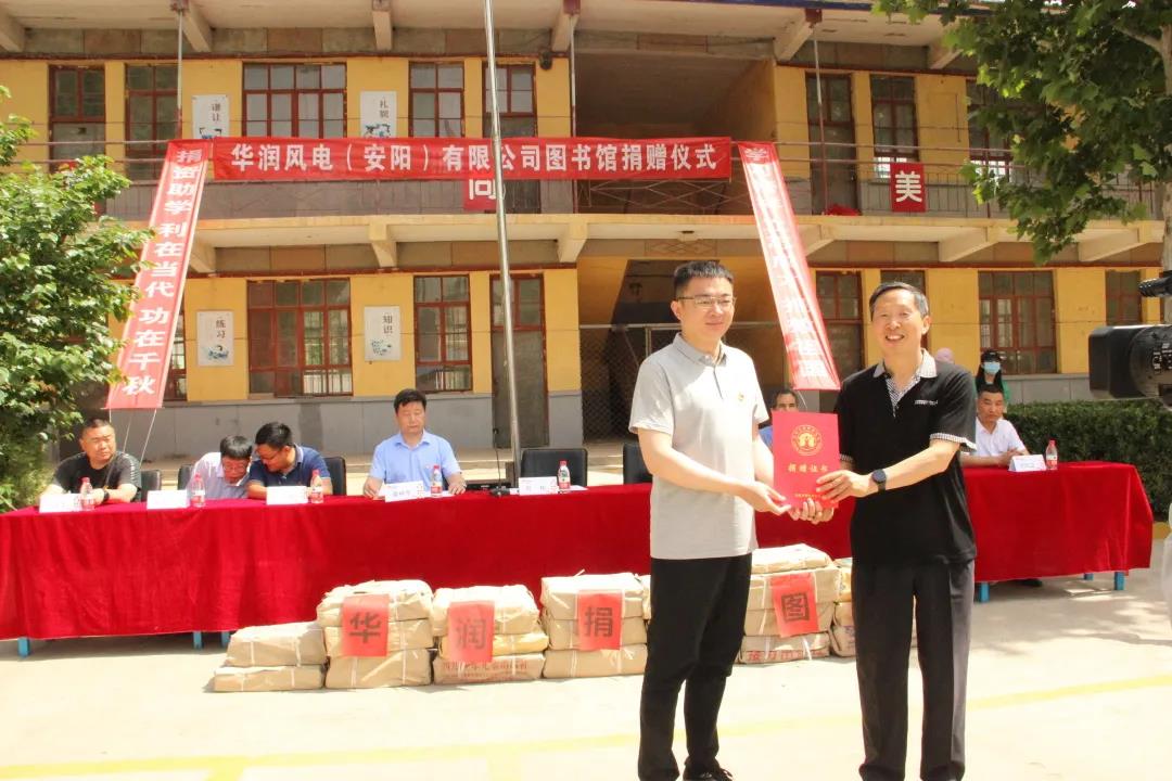 有统计显示,占我国儿童人口半数的城镇儿童,拥有童书资源的88.9%,而另外一半的农村儿童,只拥有童书资源的11.1%。对于缺少父母陪伴的乡村儿童来说,一本好书,就是面对世界的窗口。 六一儿童节前夕,由华润风电(安阳)有限公司捐建的“华润图书馆”落户安阳县北郭乡南郭村安玻希望小学和安阳县吕村镇西吕村小学。 5月28日上午,华润风电(安阳)有限公司图书捐赠暨"华润图书馆"揭牌仪式分别在两所乡村学校举行。第十一届市政协秘书长、安阳市教育基金会理事长刘星,华润电力豫北新能源公司党工委书记、总经理刘彬,受赠学校全体师生参加了捐赠仪式。仪式由市教育局原党委副书记、安阳市教育基金会秘书长董得春主持。 此次”华润图书馆“落户安玻希望小学和西吕村小学,华润风电(安阳)有限公司为两所学校共捐赠价值4.2万元的少儿图书。捐赠仪式上,刘彬(上图左)代表华润风电(安阳)有限公司首先向安阳市教育基金会进行了捐赠,刘星(上图右)代表安阳市教育基金会向华润风电(安阳)有限公司颁发了捐赠证书并宣读了《安阳市教育局、安阳市教育基金会关于支持安玻希望小学、西吕村小学建立华润图书馆的决定》。 刘星在图书捐赠仪式上表示,希望同学们珍惜这个图书馆,相信开卷有益,做到博览群书。 作为一家具有红色背景的央企,华润电力在努力发展企业的同时,竭尽所能回报社会,积极参与开展助学、扶贫、慰问、赈灾、支持地方经济发展等工作,为实现企业与社会共同可持续发展不懈努力。安阳风电项目开始建设以来,先后多次与安阳市慈善总会、安阳市教育基金会对接,帮助困难群众,对教育事业进行捐赠。 刘彬表示:今后华润电力将一如既往支持新农村建设和教育事业发展,将”新能源、新农村、新生活“的理念与地方经济社会发展深度融合,助力安阳乡村振兴战略全面实施。 农村图书资料不足,一直制约着乡村孩子阅读水平的提高。西吕村小学校长刘红卫表示,华润公司捐赠的这批图书,从数量上和内容上都极大丰富了学校图书馆。学校会将这份爱心真正送达到每一个学生。以后在图书馆的管理上,面向学生完全开放,让学生自主管理,让图书真正起到武装学生头脑的作用。 西吕村小学六年级学生李馨涵表示,在今后的学习生活中,将拟定读书计划,建立班级读书角,珍惜每一次阅读课,让缕缕书香传遍校园每个角落,让读书的我们成为西吕村小学最亮丽的一道风景。